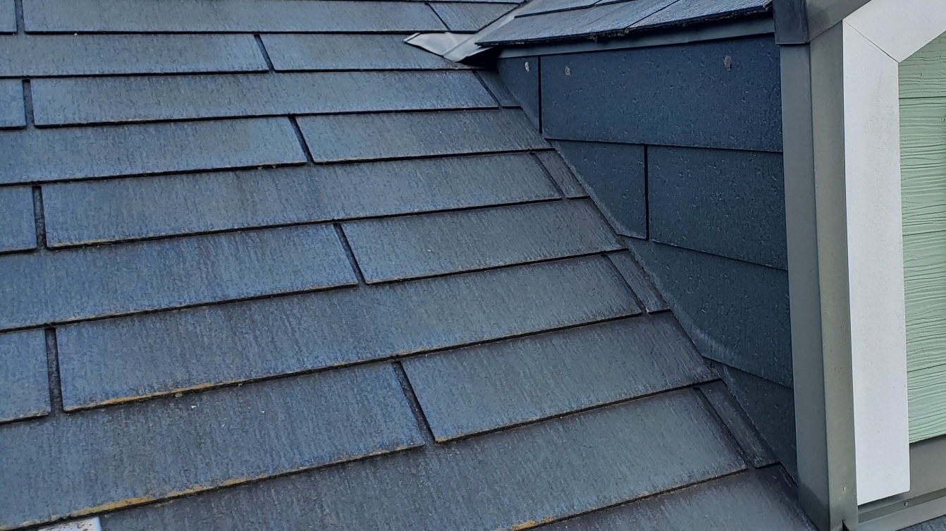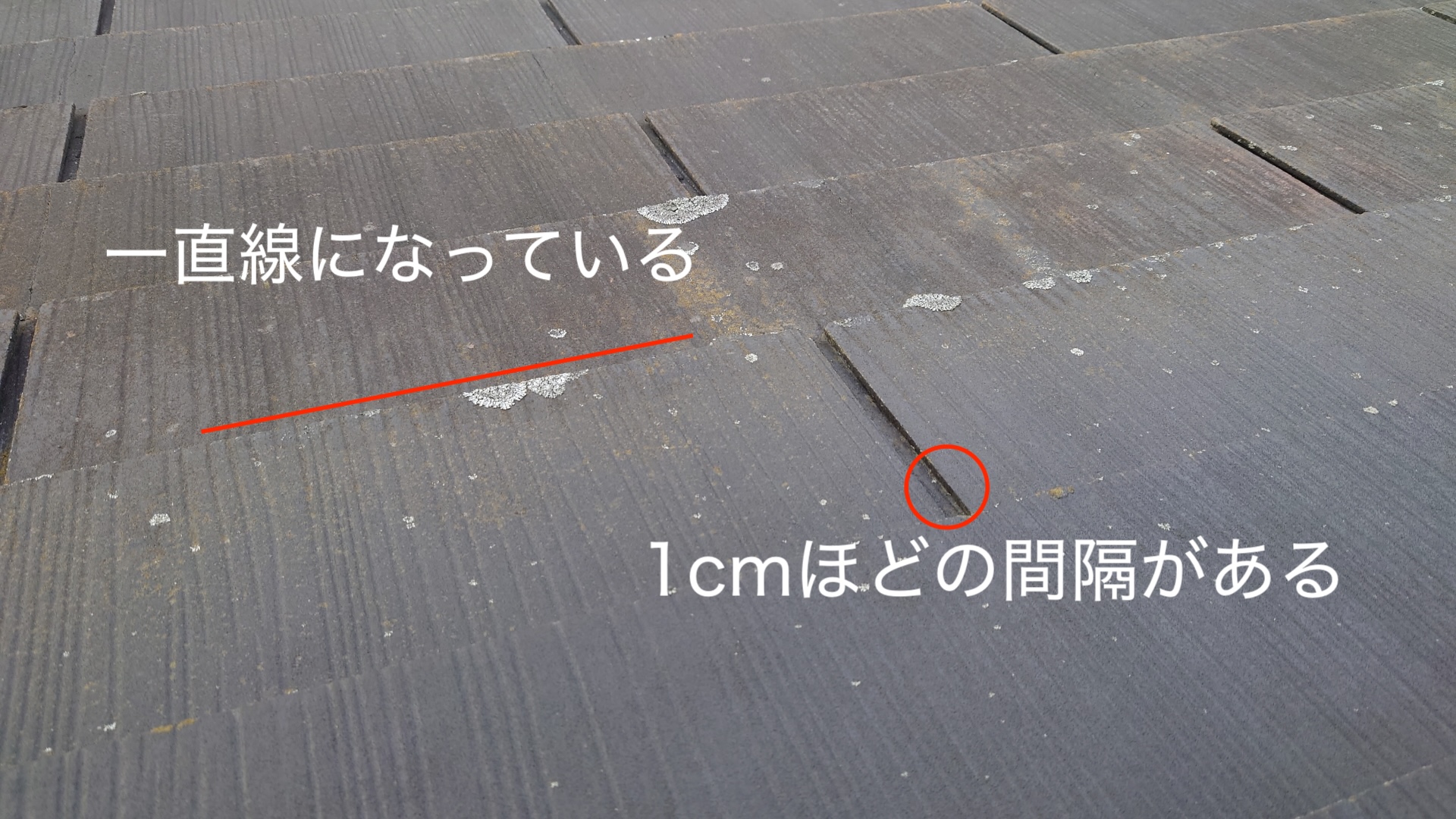 上の画像のような「1cm程度の間隔」「屋根材の下部分が一直線」が見分けるコツとなってます。