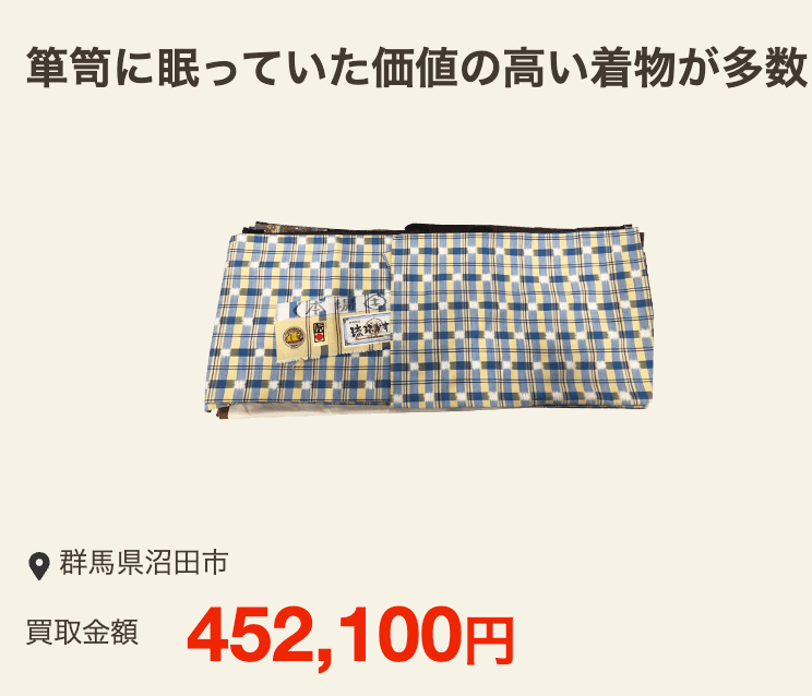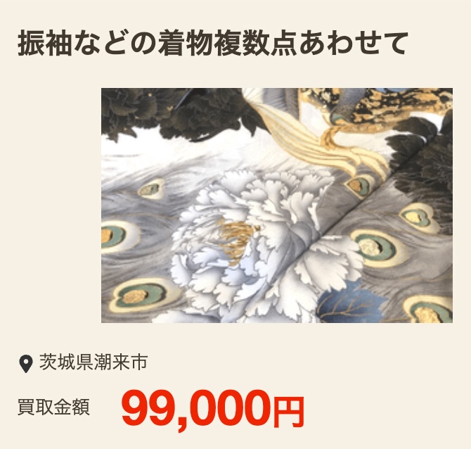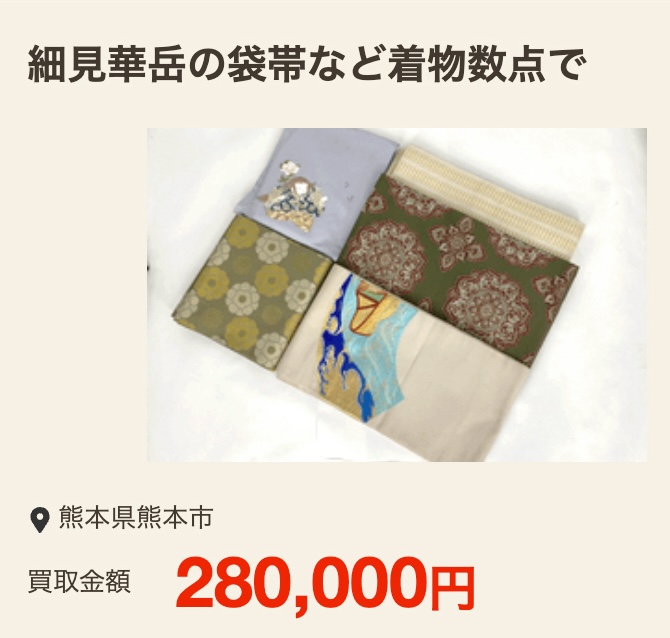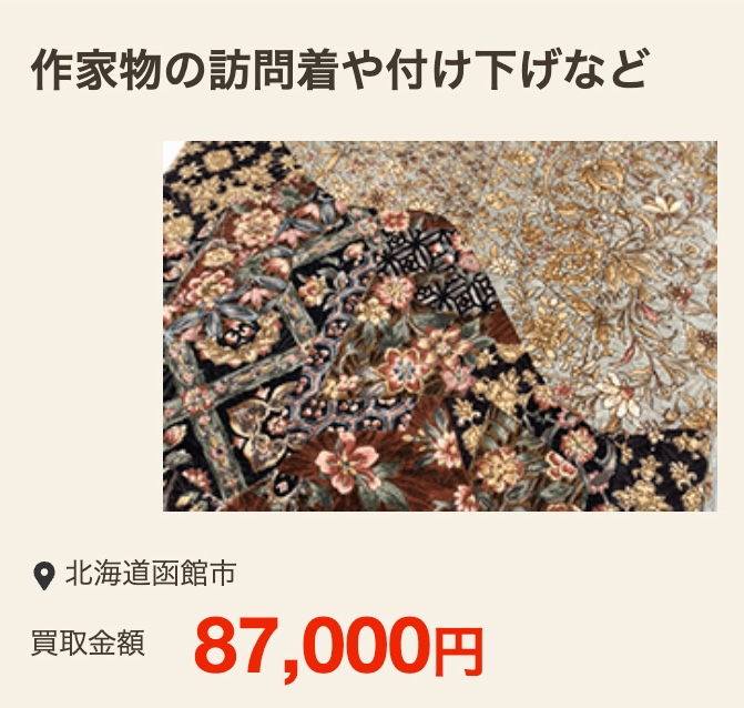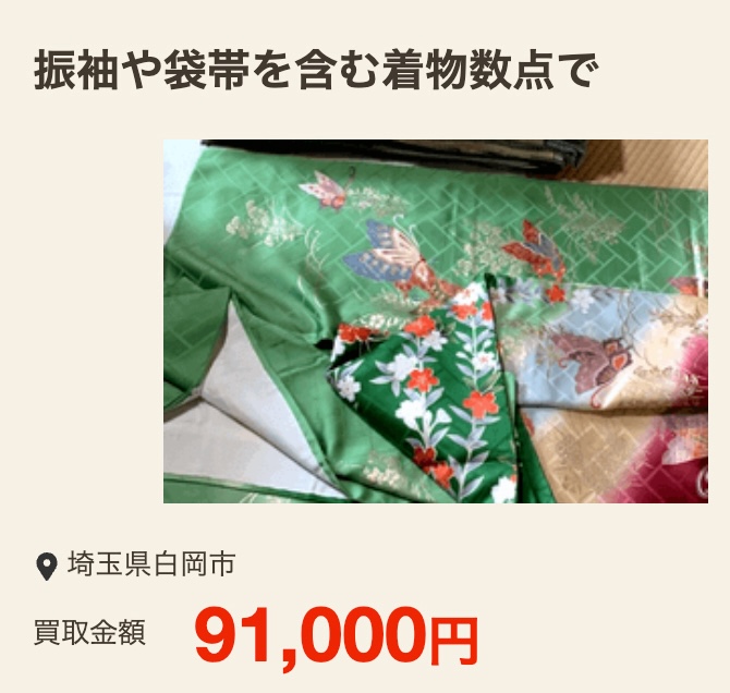 二世帯住宅に建て替えるため、荷物をコンパクトにする目的で着物と家電製品と食器類の買取依頼しました。不安の中、依頼したのですが、電話の対応も親しみやすく、最初からあまり不安はありませんでした。お若いのに着物の知識が豊富で、子供の頃から着物に親しまれて育ったそうで、着物のお仕事は天職ですね。