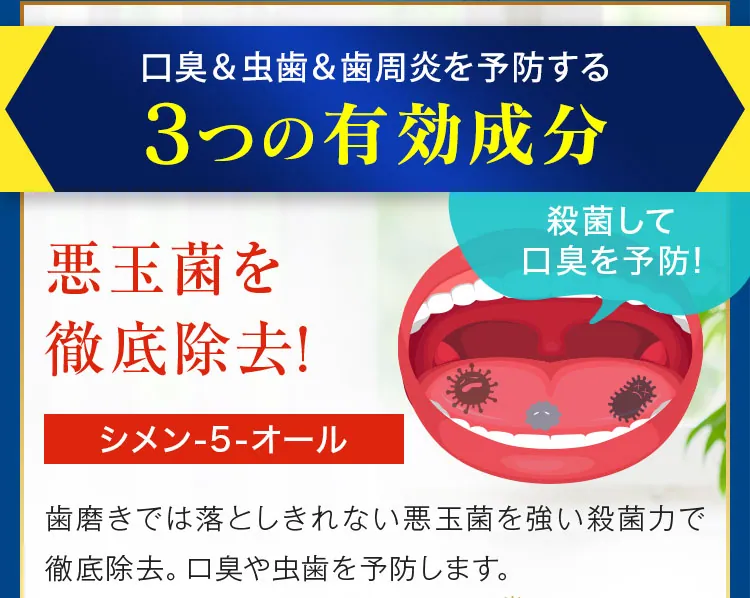 この成分が歯磨きで落とせなかった悪玉菌(口臭の原因)を徹底殺菌してくれます!