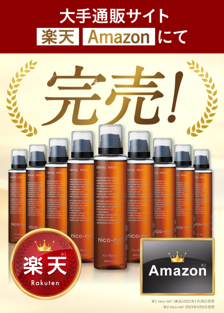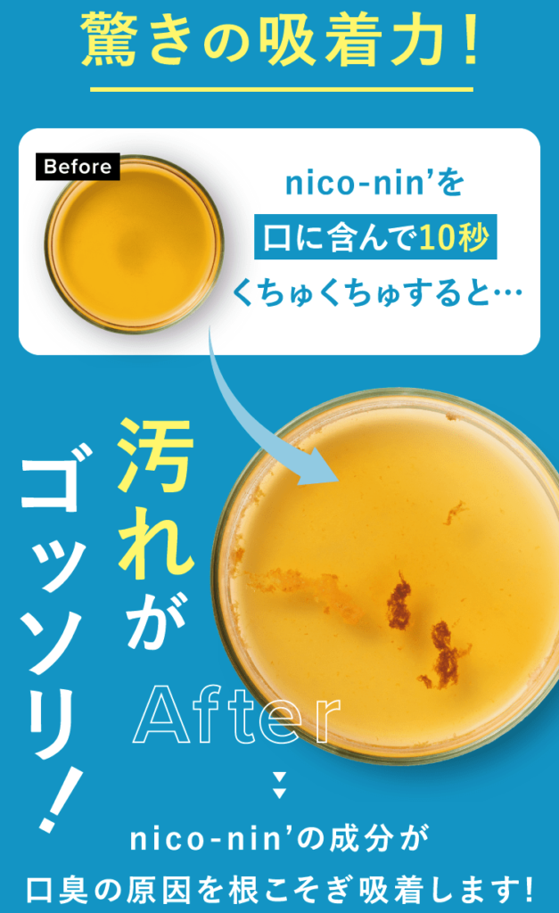 ニコニンも歯磨きで取れなかったタンパク質などの汚れが見えるマウスウォッシュ。