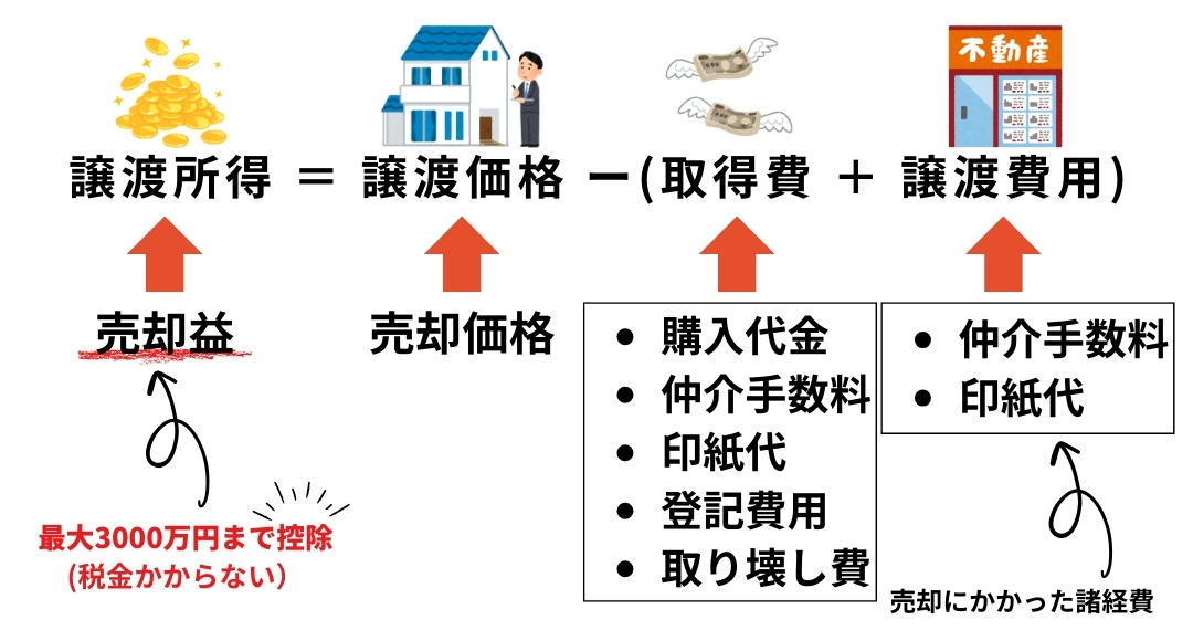 譲渡所得=売却代金−(取得費 + 譲渡費用)−特別控除額